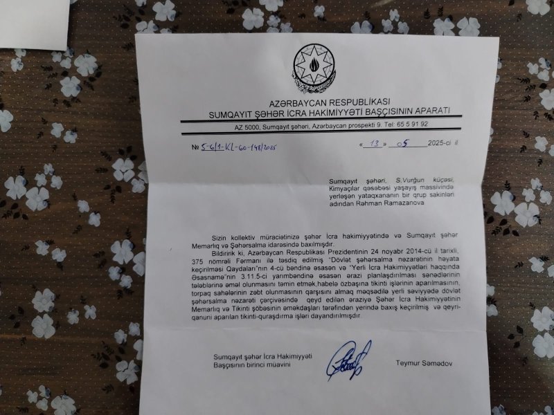 Sumqayit.tv Tribunainfo.az-a istinadən xəbər verir ki, sakinlərin sözlərinə görə, poçt/rabitə xidmətləri üçün nəzərdə tutulmuş ərazini şəhid atası Şakir Qasımov adlı şəxs həmin sahədə qanunsuz zəbt (fərdi ev və ya şirniyyat sexi tikintisi məqsədi ilə istifadəyə cəhd) etmişdir. Hansı ki, həmin şəxs əvvəllər məktəb və gediş-gəliş üçün nəzərdə tutulmuş yolu da zəbt etməyə səy göstərmişdir. Lakin, vətəndaşların etirazı ilə qanun çərçivəsində icazə verilməmişdir. 13.05.2025-ci il tarixində kollektiv müraciətlərə əsasən, Sumqayıt şəhər Memarlıq və Şəhərsalma idarəsindən baxış keçirilmiş və qeyri-qanuni aparılan tikinti-quraşdırılması işləri dayandırılmışdır.