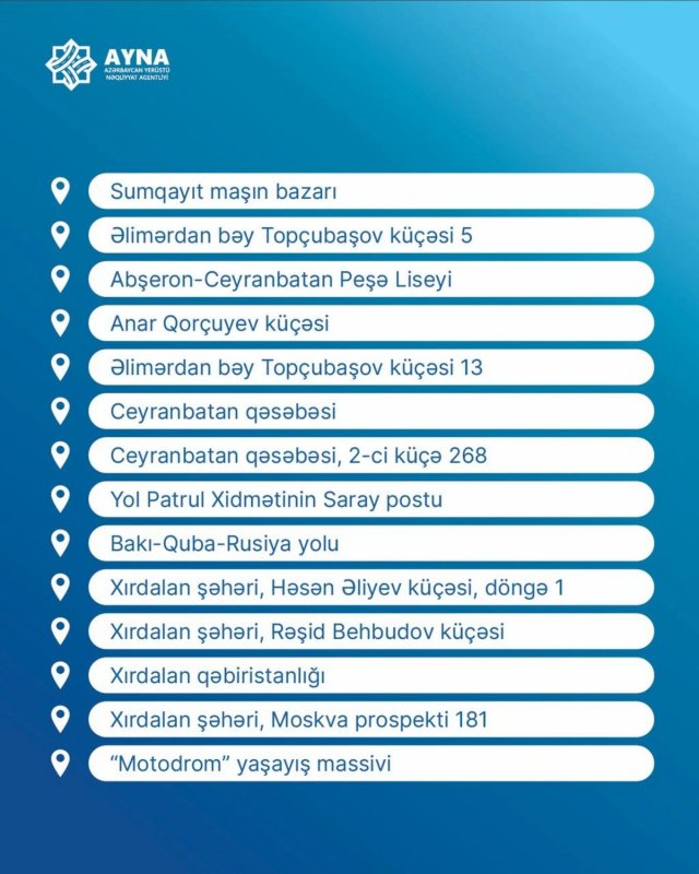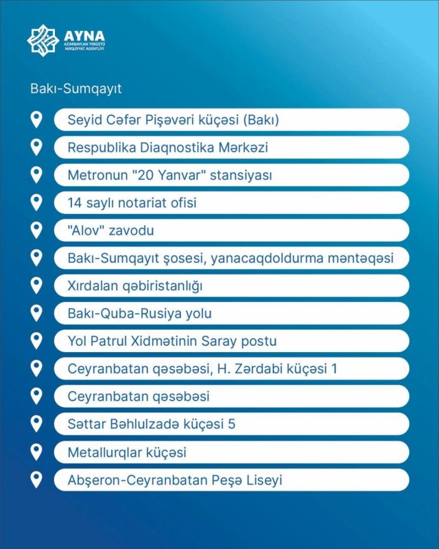 Rəqəmsal İnkişaf və Nəqliyyat Nazirliyi yanında Azərbaycan Yerüstü Nəqliyyat Agentliyi (AYNA) Sumqayıt şəhərindən paytaxta təşkil edilən 500 nömrəli müntəzəm avtobus marşrutunun dayanacaq məntəqələrini açıqlayıb.