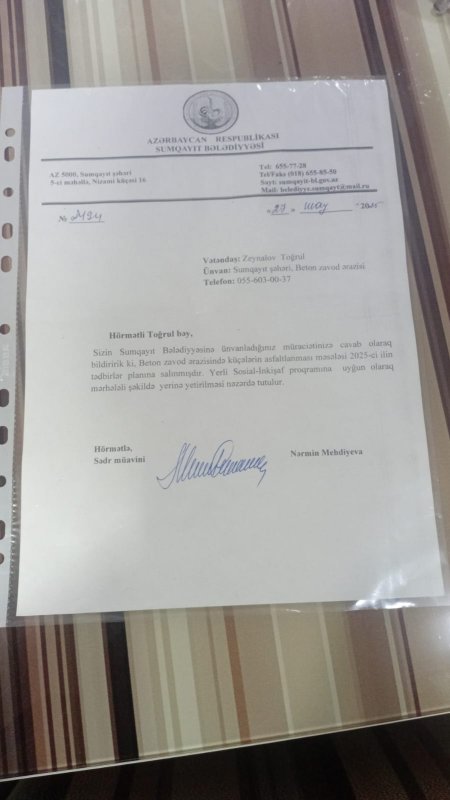 Sakinlər bildirirlər ki, məsələni dəfələrlə müxtəlif qurumlara və mediaya çatdırmalarına baxmayaraq, vəziyyət dəyişməz qalır. Ötən il Sumqayıt şəhər Bələdiyyəsinə edilən rəsmi müraciətə cavab olaraq ərazinin asfaltlanmasının 2025-ci ilin tədbirlər planına daxil edildiyi bildirilib. Lakin ilin başa çatmasına sayılı günlər qalsa da, ərazidə heç bir iş görülməyib.