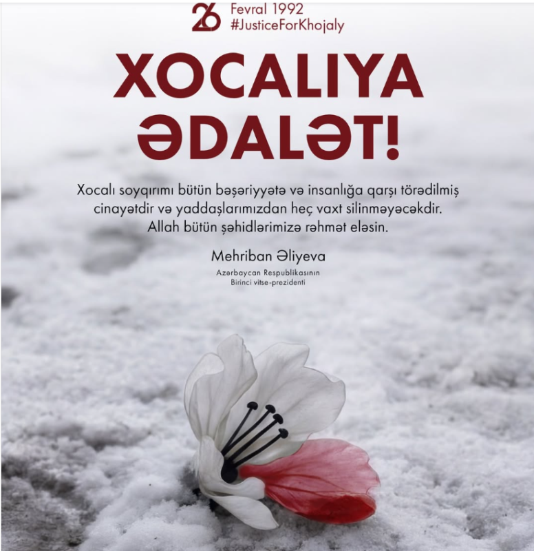 Azərbaycan Respublikasının Birinci vitse-prezidenti Mehriban Əliyeva sosial şəbəkə hesablarında Xocalı soyqırımının 34-cü ildönümü ilə bağlı paylaşım edib.